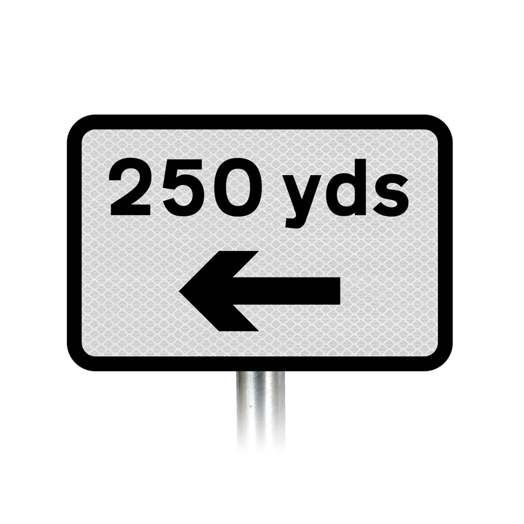 This supplementary plate can be used in conjunction with other permanent warning signs to indicate how far it is to a hazard, and what direction that hazard is in.